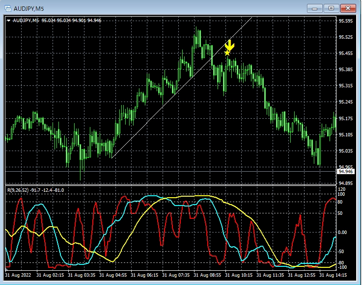 下位足の4時間足を見ると、下降トレンドラインを上抜けした後の押しでRCI3本ラインの中でRCI9のみが下げている。もし仮にRCI9が上昇に転じれば、RCI3本そろって上昇のとても強い形になることも想定されることから、押し目買いを狙ってもおかしくない場面と言えるかもしれない。