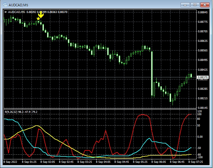 下位足の1分足を見ると、RCI3本ラインの中でRCI9のみが上昇している場面がある。ここで、もし仮にRCI9が下降に転じれば、RCI3本そろって下降のとても弱い形になることも想定されることから、戻り売りを狙ってもおかしくない場面と言えるかもしれない。