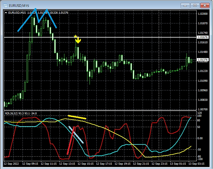 その後、RCI9がいったん下げてから上昇する際にはすでにRCI26とRCI52が下げに転じていて、ダブルトップの右側の山でmBDSR(RCI2本フィルター)の戻り売りサインが点灯してプライスは下げている。