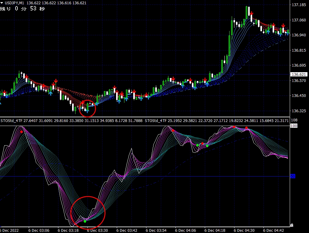 ※ 1分足用インジケーターとして説明しておりますが、当インジケーターは