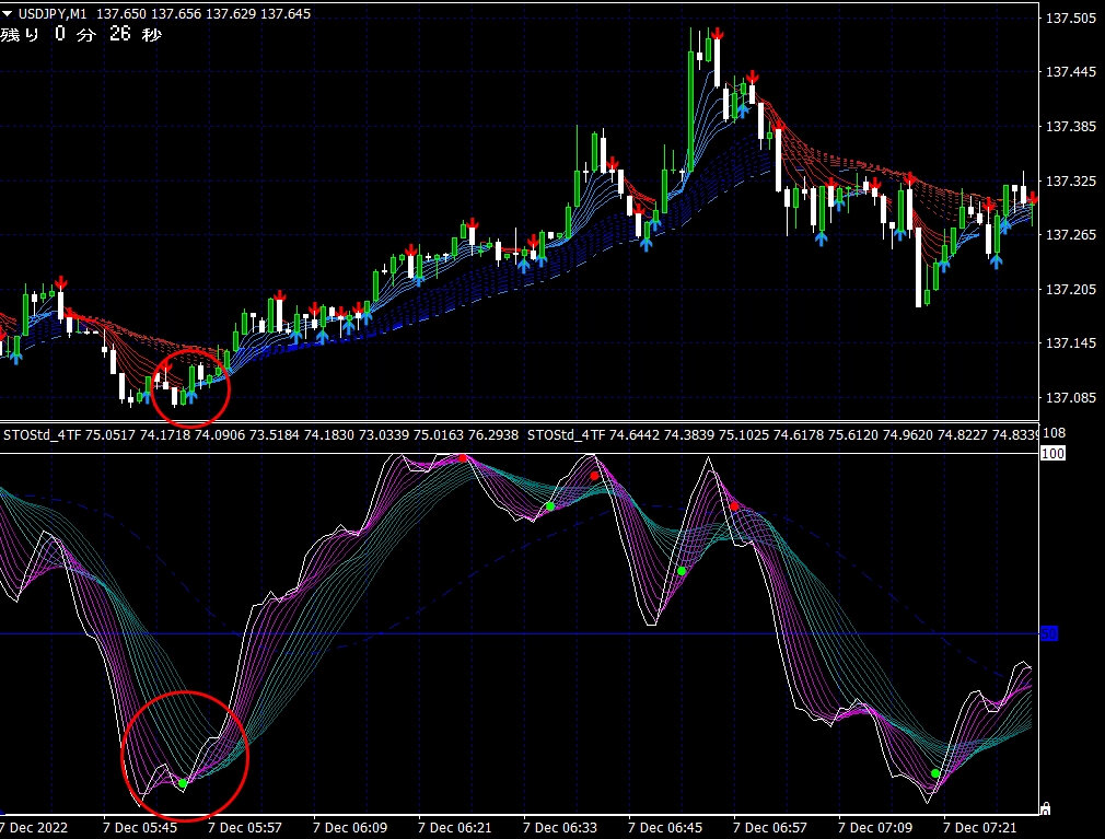 ※ 1分足用インジケーターとして説明しておりますが、当インジケーターは