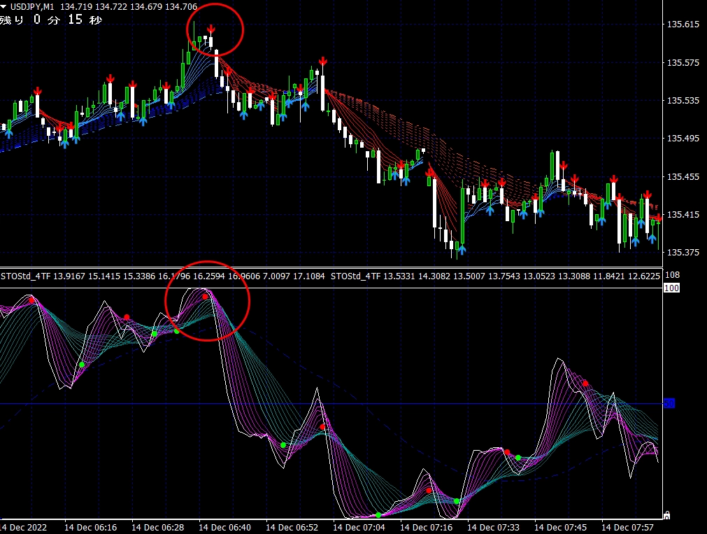 ※ 1分足用インジケーターとして説明しておりますが、当インジケーターは