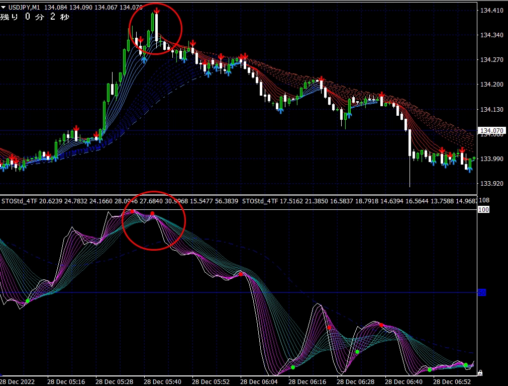 ※ 1分足用インジケーターとして説明しておりますが、当インジケーターは