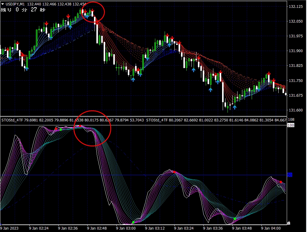 ※ 1分足用インジケーターとして説明しておりますが、当インジケーターは
