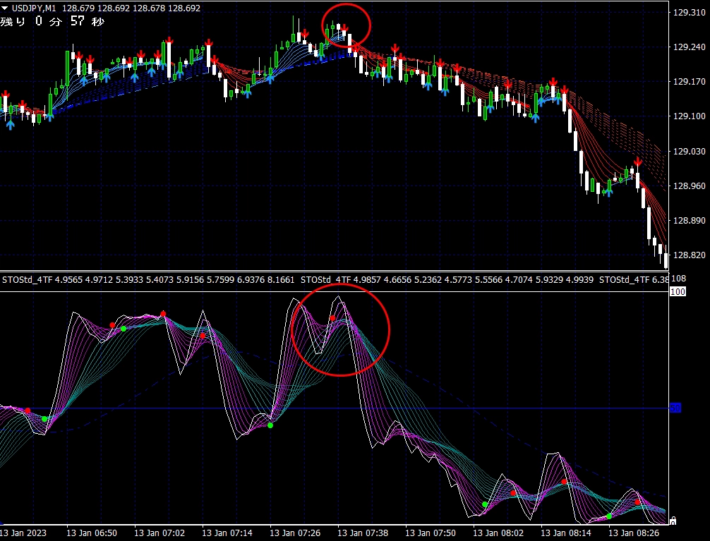 ※ 1分足用インジケーターとして説明しておりますが、当インジケーターは