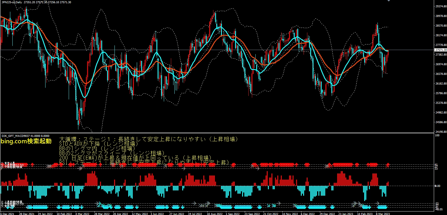 標準偏差レンジが上昇していることから、価格の変動が大きくなっており、市場が不安定であることが示されます。BBの2シグマ上抜けは、価格が上限を超えていることを示し、売りシグナルとなっています。200時間