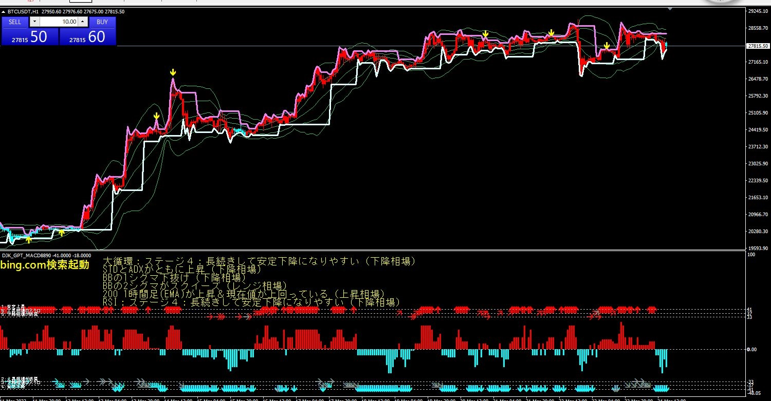 上記で、標準偏差レンジとADXがともに上昇していることから、相場は下降相場である可能性があります。