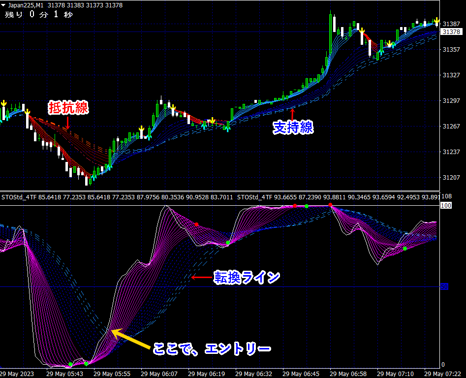 天底チャート(令和版)では、移動平均線だけでなく、インジケーターの曲線帯にも支持線・抵抗線=転換ラインとして機能するラインを分かりやすく表示しています。