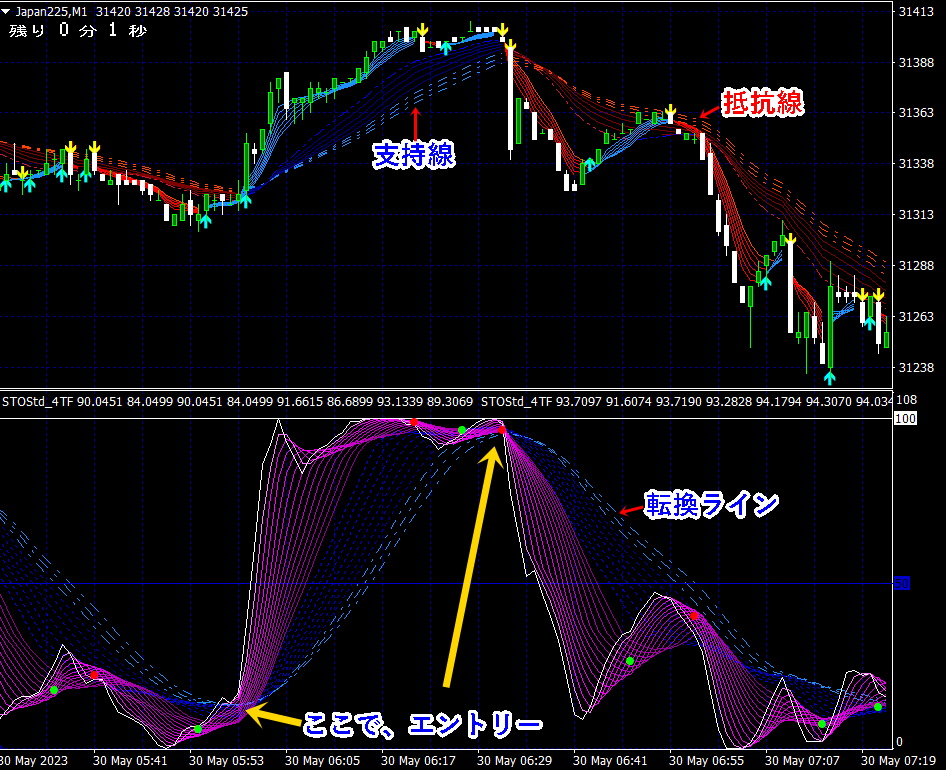 天底チャート(令和版)では、移動平均線だけでなく、インジケーターの曲線帯にも支持線・抵抗線=転換ラインとして機能するラインを分かりやすく表示しています。