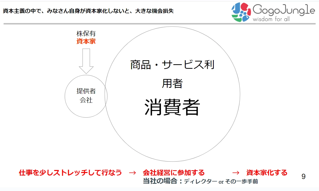 また、自分が所属する会社の株式を持って、自ら商品やサービスを創るということは、配当や将来の何らかのタイミングでキャピタルゲインを得ること以前に、心の何処かに経営に参加しているんだという意識が芽生え、もう少しストレッチして仕事をしてみよう、ユーザーのニーズをもう少し知る努力をしてみようなどの行動を生み出します。