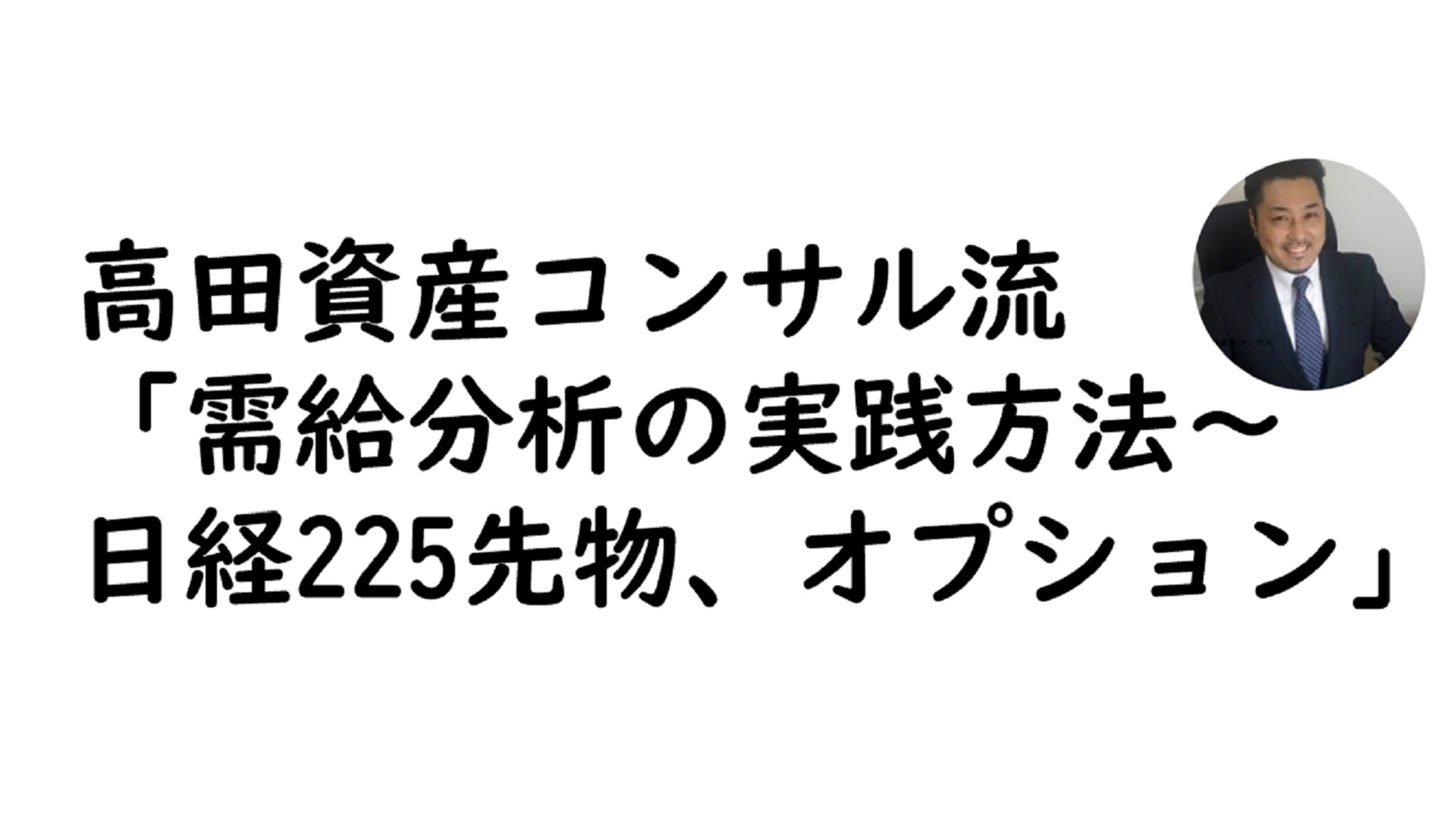 *9月30日、お知らせ。 高田資産コンサル流「日経225先物・日経225オプションの需給分析の実践方法」(投資ナビ+版)につきましては、2023年11月30日で連載を終了させていただきますので、何卒よろしくお願い申し上げます。 投資ナビ+では、高田資産コンサル流の「日経225先物・日経225オプションの需給分析の実践方法」について、 定期的に更新をしてまいります。 需給分析の技術を実践レベルまで高めるためには、相当な時間が必要ですが、繰り返しご覧いただくことで、 本当に役立つ実践的な需給分析ができるようになっていきます。 また、私自身は、需給分析をチャート分析と絡めて利用しており、自分の資産運用に大いに役立てております。 需給分析とチャート分析を組み合わせることで、需給分析の弱点をチャート分析で補い、 逆に、チャート分析の弱点を需給分析で補うことが可能です。 投資ナビ+で更新する内容は下記の4つです。 (1)海外勢全体の先物手口のグラフ →海外勢が全体で買い越しか売り越しかでトレンドの判断、相場の強弱の判断に利用をしております。 (2)各社のオプション手口のグラフ(主要な3~6社程度) →大口投資家の仕掛け、上値を狙う手口、下値を支える手口、相場の節目の判断に利用をしております。 (3)大口のオプション手口、クロス取引(国内勢も含めて全社チェック) →大口投資家の仕掛け、上値を狙う手口、下値を支える手口、相場の節目の判断に利用をしております。 なお、大口のオプション手口、クロス取引が無い日もございます。 (4)グラフ、手口の読み方、見方 →グラフ、手口の読み方、見方を説明しております。