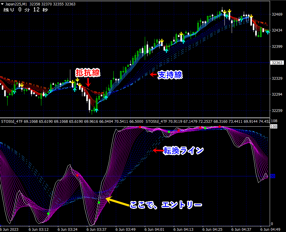 天底チャート(令和版)では、移動平均線だけでなく、インジケーターの曲線帯にも支持線・抵抗線=転換ラインとして機能するラインを分かりやすく表示しています。