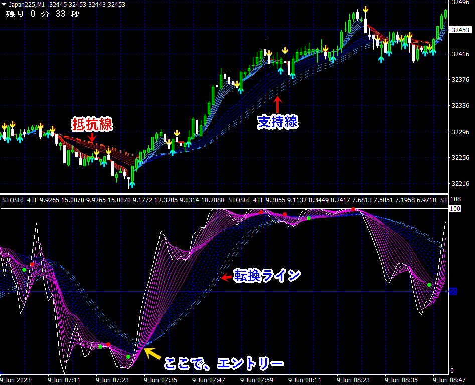 天底チャート(令和版)では、移動平均線だけでなく、インジケーターの曲線帯にも支持線・抵抗線=転換ラインとして機能するラインを分かりやすく表示しています。