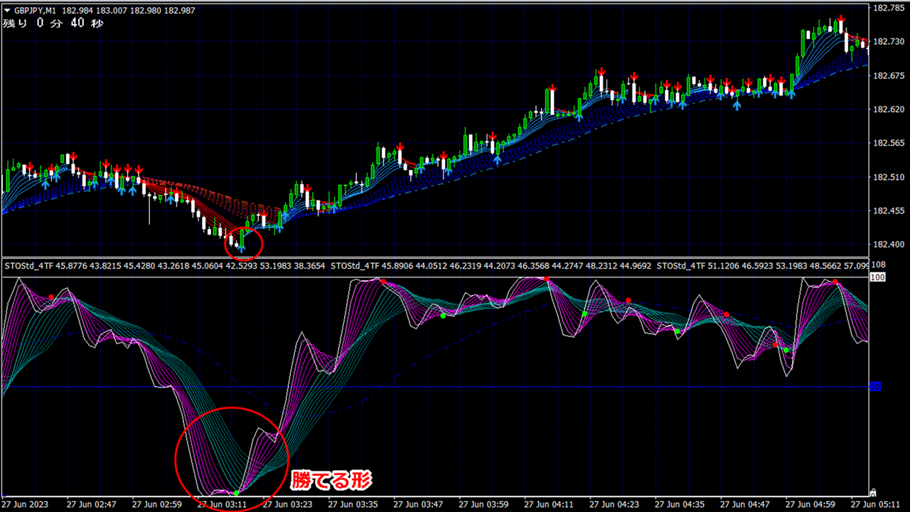 ② 矢印サイン点灯状態で、インジケーターのピンク色の帯が、緑の帯を下からすくい上げるような形状であれば、現在のローソク足が確定する数秒前か確定の直後に1分判定または3分判定でハイエントリーします。
