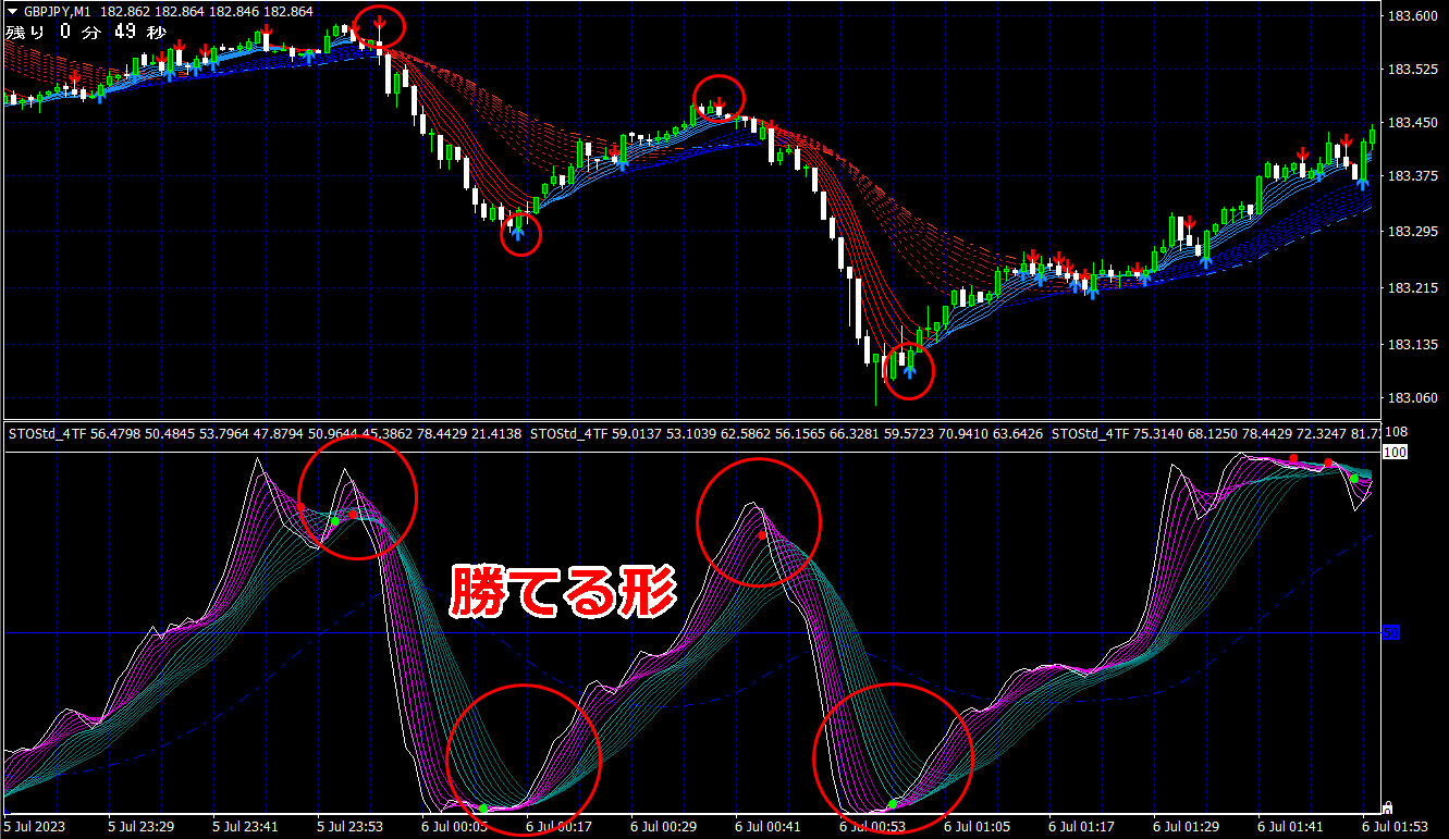 ★ サイン点灯後、ピンク帯が緑帯に覆いかぶさる、またはすくい上げる形状で必勝エントリー!