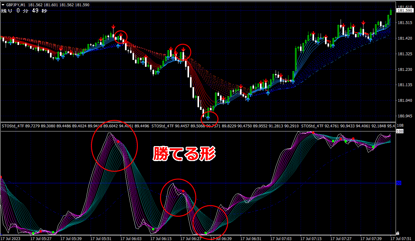 ★ サイン点灯後、ピンク帯が緑帯に覆いかぶさる、またはすくい上げる形状で必勝エントリー!