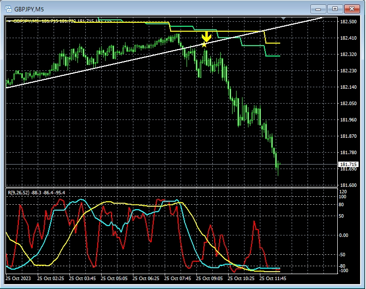 5分足では過去の目立つ高値を示すライン近くまで下げた後、mBDSR(RCI2本フィルター)の押し目買いサインが点灯し、その直後からプライスが順調に上昇していることが分かる。