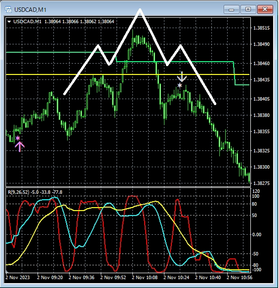 1時間足では「過去の目立つ安値を示すライン」を下抜けした後に同ライン付近まで戻してきたところで、mBDSR(RCI2本フィルター)の戻り売りサインが点灯して下げ。その後、RCI3本下げの弱い形となり、R1R2S2の戻り売りサインも点灯。更に下げ。