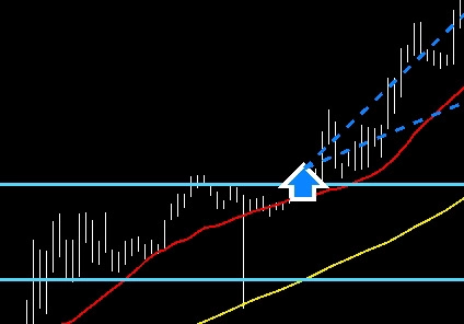 4時間足、水色ライン上抜けから再度押し目からの上昇が入ってきているところ