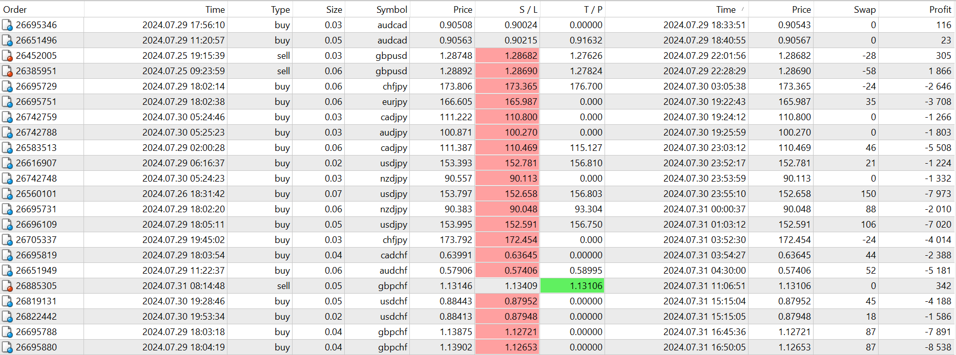 今週前半、REAL TRADE を振り返るとUSDJPY、AUDJPY、CHFJPY、NZDJPYのロングポジションを積極的に持ちましたが、200pips、もっと行けると思い。伸ばすトレードに専念したところ、REAL TRADEでは16ポジションを保有していて、トレールを置き直しをしていなかったばっかりに(今週は、利確の場所も設定をあまりしていなかった感じです。)結果的に、最初の損切ラインの方で終了をしました。ポジションを持った時の最初の設定で、大きめに余裕をもって損切ラインも取っていたため、普通より損失があるかと思います。