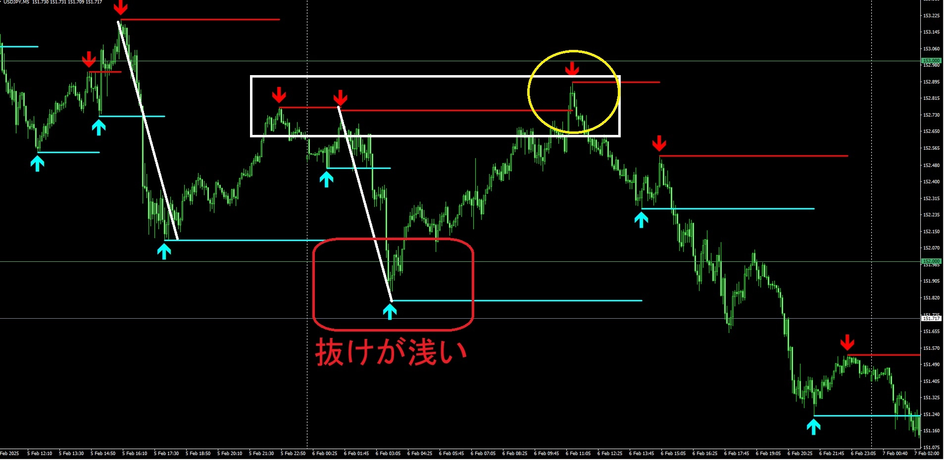 昨日(2025年2月7日)のドル円5分足チャートです。今週は4時間足などの上位足で見ても邪魔するものがなく一方的な下落トレンドが続くことが予想されていましたので、サルになってショートすれば勝てるボーナスデイだったかと思います。