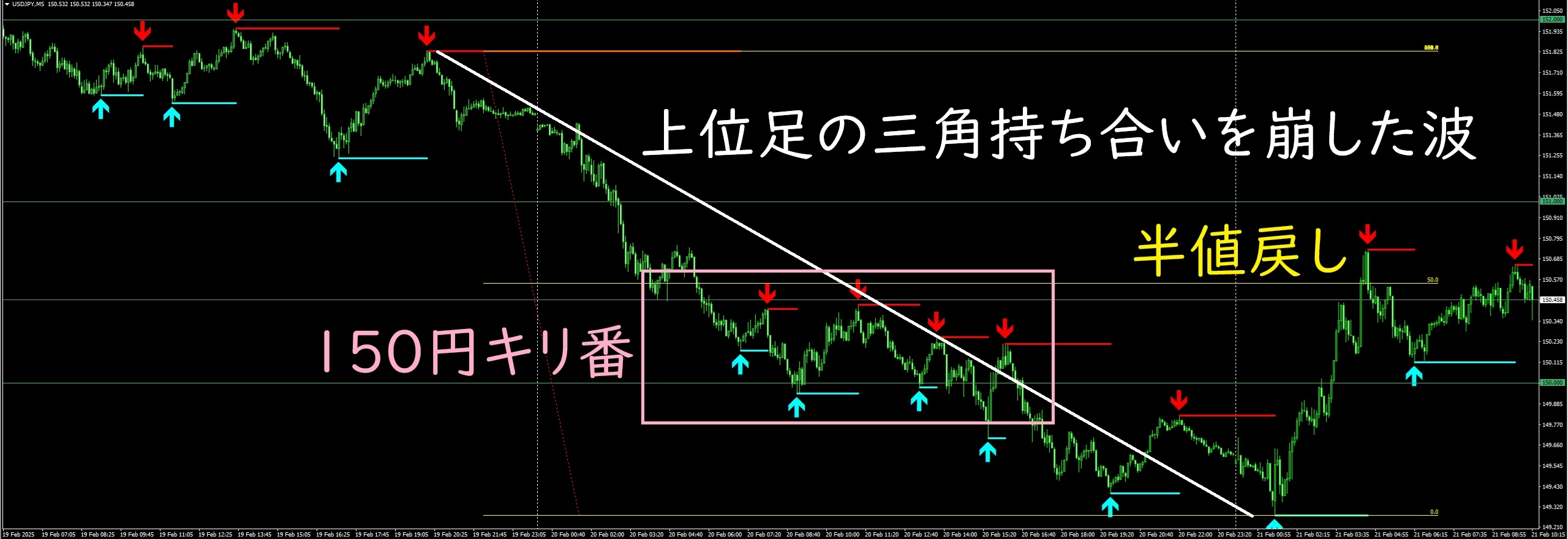 兼ねてから「4時間足レベルでは12月上旬に見せたように150円を挟んで乱高下する」と動画などで話しておりましたが、現時点ではその仮説が的中しています。