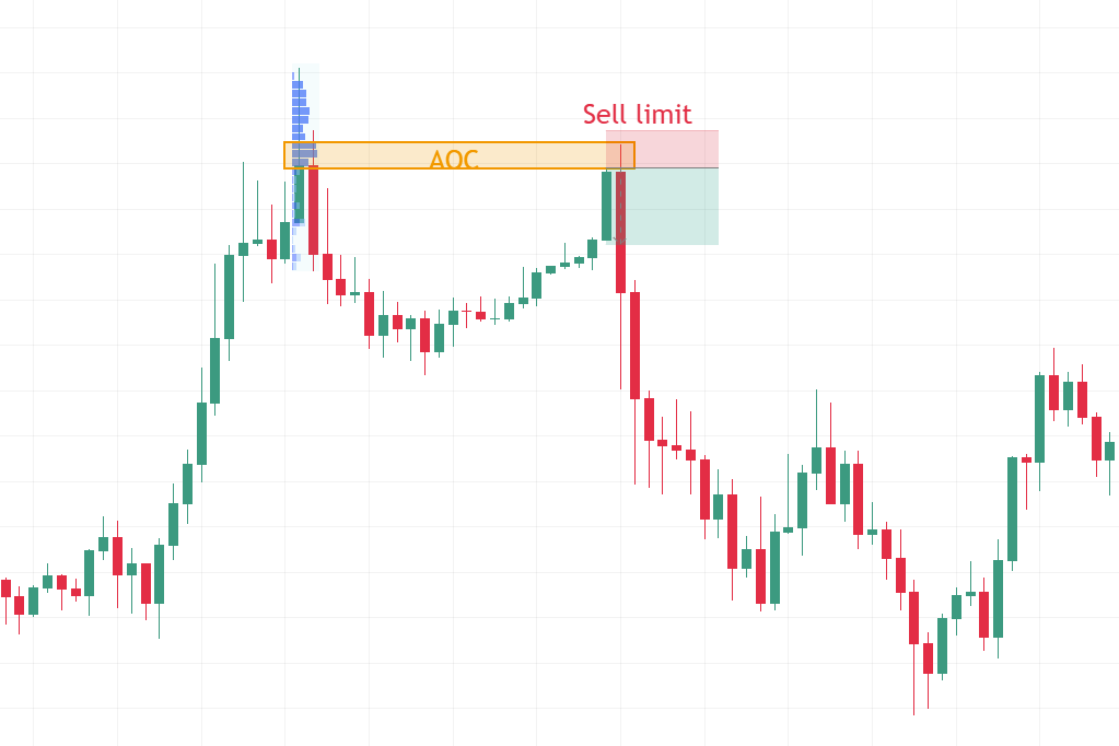 上昇を拒否された場合(売り注文): その拒否ローソク足内で測定したPOC/AOCの領域に売り指値(Sell Limit)注文を置きます。