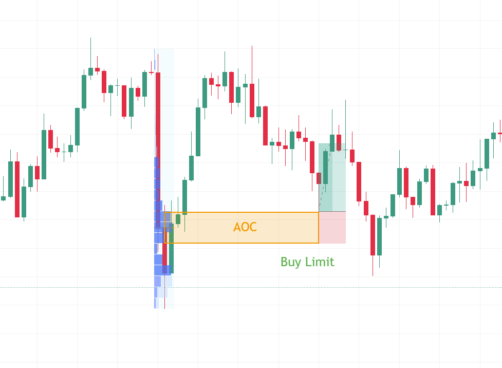 下落を拒否された場合(買い注文): その拒否ローソク足内で測定したPOC/AOCの領域に買い指値(Buy Limit)注文を置きます。