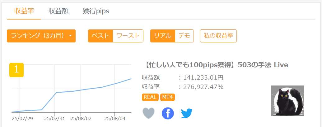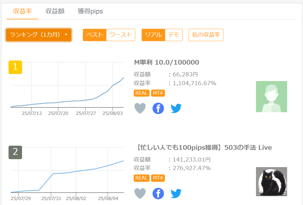リアルアカウント、トレード3ヵ月の収益率では、ランキングが確認できます。