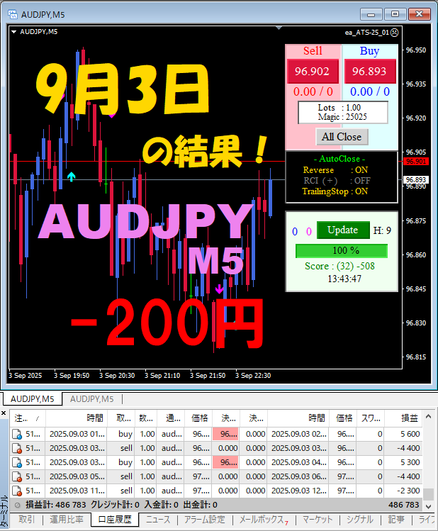 【前日の結果】AUDJPY M5 『ATS-25』9月3日 (-)
