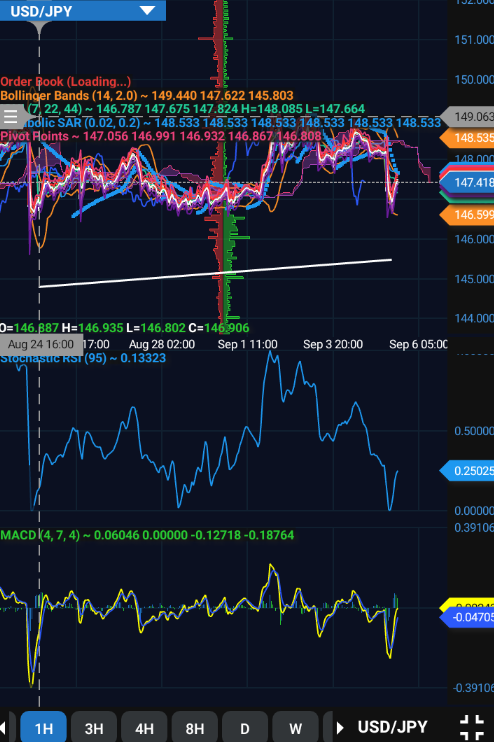 動いて来る軸が、4H(上、下)と1H(下ボリンジャーバンド)後にDAILY(下)だと思うので、上へはあまり戻らないことなどを考慮し、再度の落下に注意しましょう。