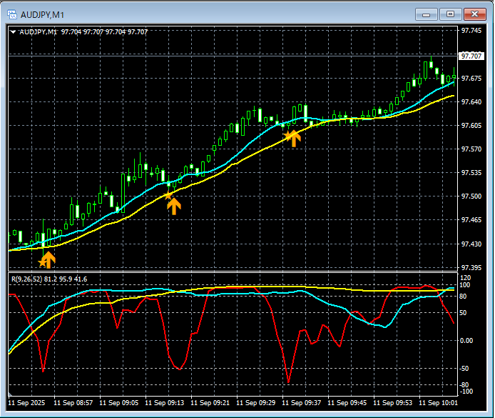 質実剛健FX【RCIを極めて移動平均線フィルターで勝つ!! 豪ドル円 1分足】mBDSRのサイン