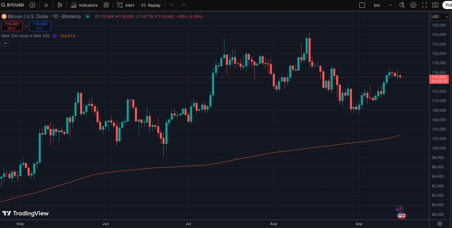 ビットコインは先週の11万ドルから11万5千ドルに上昇。現在少し下落調整となっています。