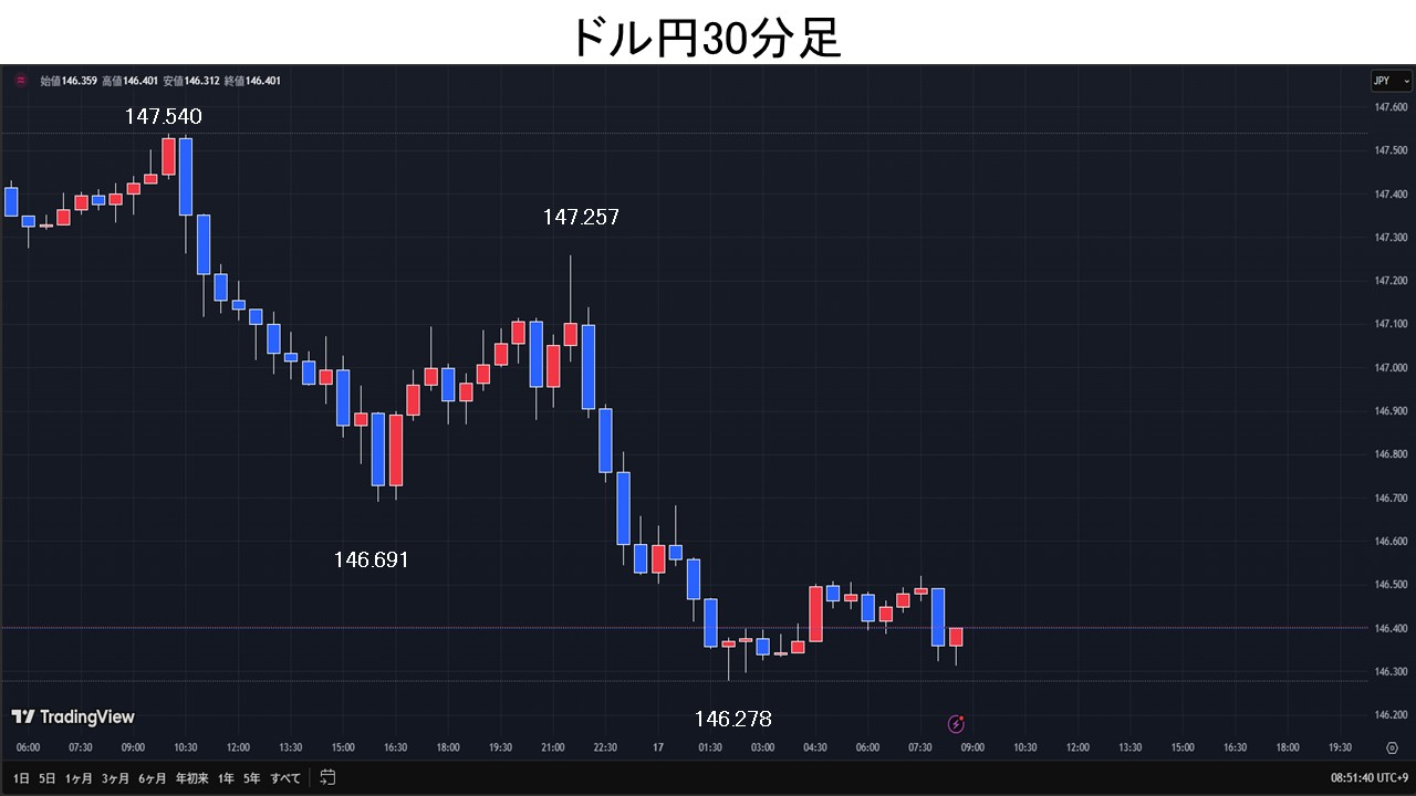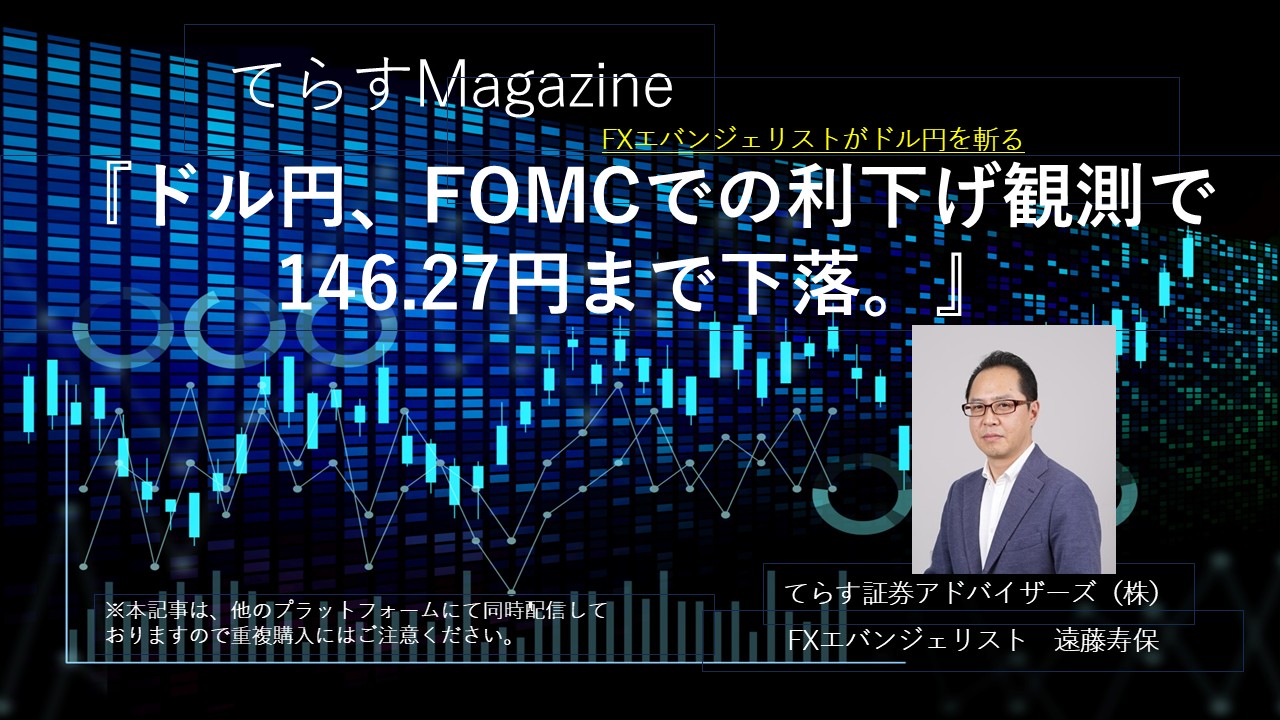 ドル円、FOMCでの利下げ観測で146.27円まで下落。