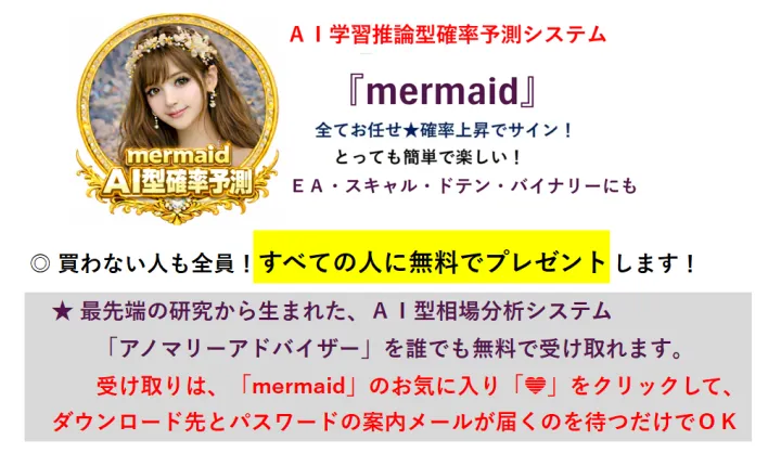 ★見た人全員に「アノマリーアドバイザー」のプレゼントを開始しました★ 全てお任せ★確率が上昇するとサイン!『mermaid』とっても簡単で楽しい! EA・スキャル・途転・バイナリーにも‼ https://www.gogojungle.co.jp/tools/indicators/76876 ...