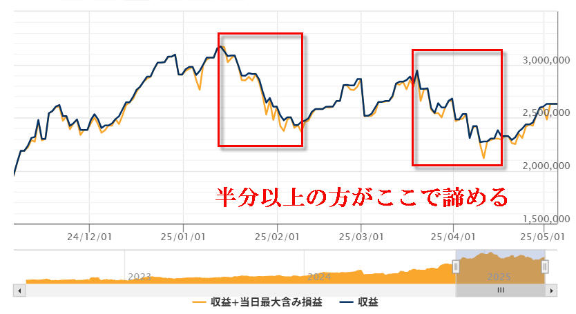 ・リスクリターン率:期間中損益の合計÷最大ドローダウン