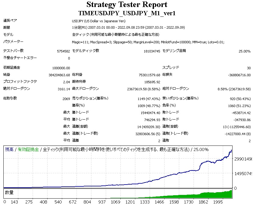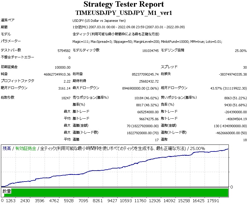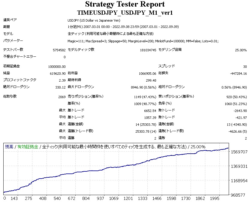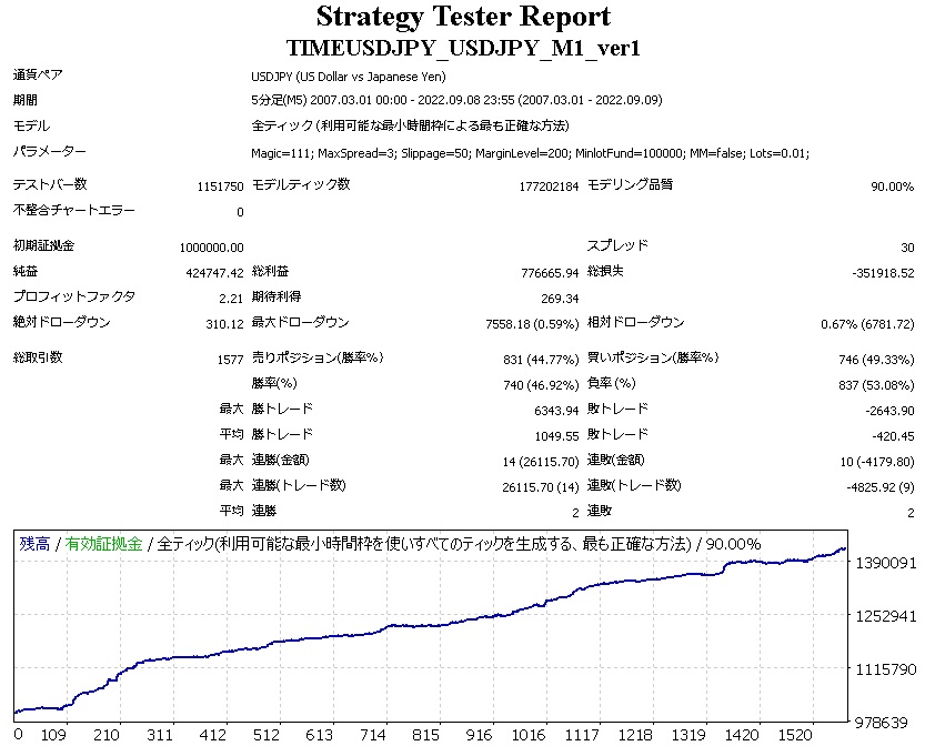 MM           false=単利運用。true=複利運用。 Lots      単利運用時のロット。(複利時は関係なし) パラメーターMinlotFundの詳細 資金いくらあたりで最小ロット×1をとるかを指定します。 例:MinlotFund=100000で稼働業者の最小ロットが0.01であるとき、口座残高10万円だと0.01ロットをとる(円口座の場合) 例:MinlotFund=100000で稼働業者の最小ロットが0.1であるとき、口座残高20万円だと0.2ロットをとる(円口座の場合) MinlotFundの値が大きいほどローリスクローリターンで、 MinlotFundの値が小さいほどハイリスクハイリターンになります。 MinlotFundの値を小さくしすぎて、その残高では取れないロットを算出してしまう場合には、Not enough moneyとAlertが出て新規ポジションを取りません。 ※ロットの価値は業者によって変わることにご注意下さい。 最適なMinlotFundの設定をバックテストで求める際は、エキスパート設定の口座通貨を、稼働口座の口座通貨と同じにしてテストして下さい。 エキスパート設定の初期証拠金の口座通貨欄にJPYが無い場合は、手動でJPYと入力して下さい(稼働口座が円口座の場合)。 バックテストの際は、MetaTraderに標準で付属しているPeriodConverterを用いる方も多いと思いますが、PeriodConverterを使うとデータが一部ずれるので正確なテスト結果が出ません。PeriodConverterを用いたヒストリカルデータのテストでは、掲載したバックテスト結果とは異なる結果になる可能性があります。