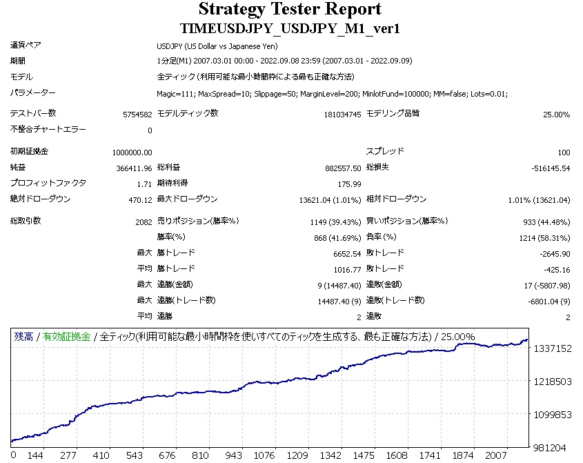 このEAは始値のみ動作で1分間に1度動作させたいので、1分足にしています。 1分足のバックテストは、モデリング品質の最大値が25%で信用ならない説があります。しかしそれはスキャルピングの場合の話で、保有期間が長い場合には関係ありません。
