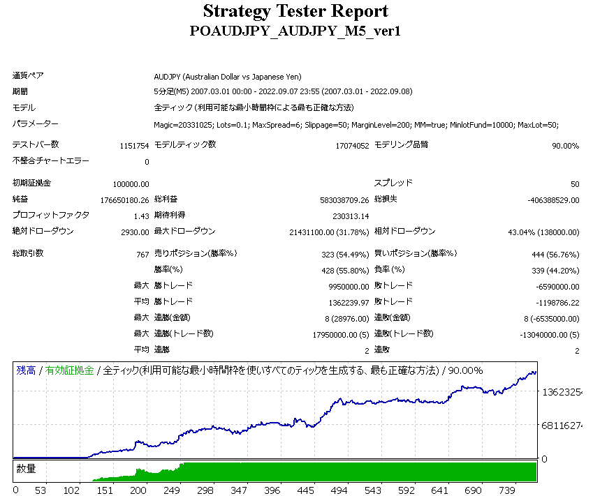 最適なMinlotFundの設定をバックテストで求める際は、エキスパート設定の口座通貨を、稼働口座の口座通貨と同じにしてテストして下さい。 エキスパート設定の初期証拠金の口座通貨欄にJPYが無い場合は、手動でJPYと入力して下さい(稼働口座が円口座の場合)。 バックテストの際は、MetaTraderに標準で付属しているPeriodConverterを用いる方も多いと思いますが、PeriodConverterを使うと曜日が一部ずれるので正確なテスト結果が出ません。PeriodConverterを用いたヒストリカルデータのテストでは、掲載したバックテスト結果とは異なる結果になる可能性があります。