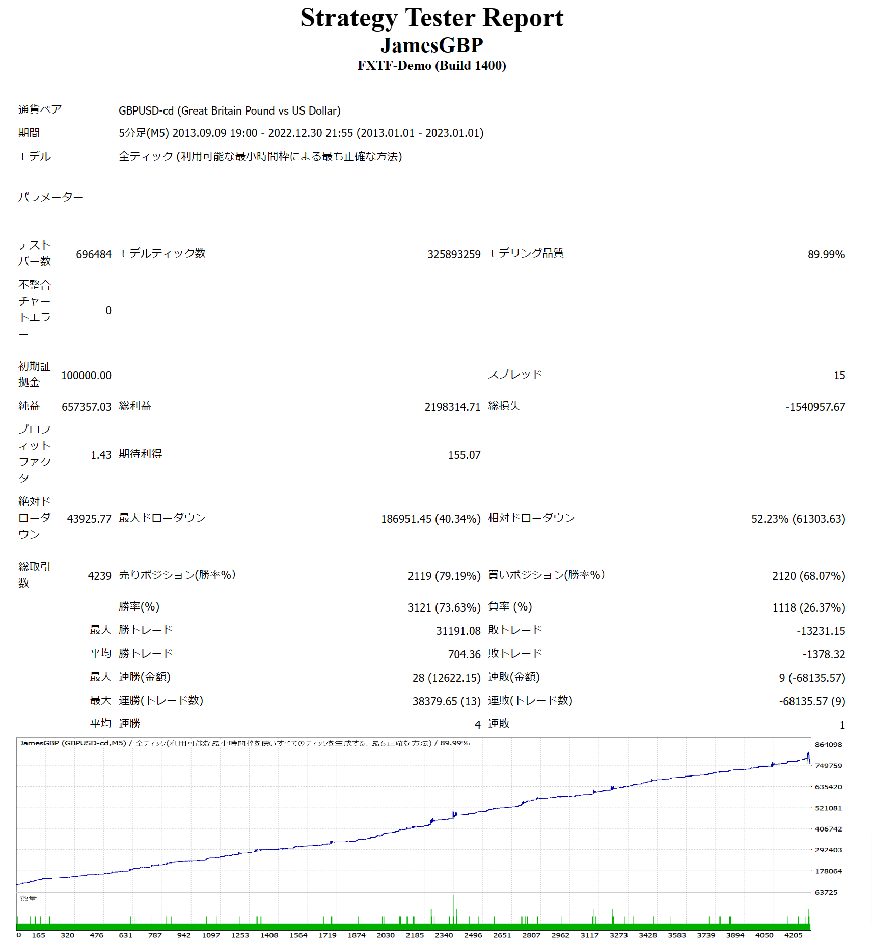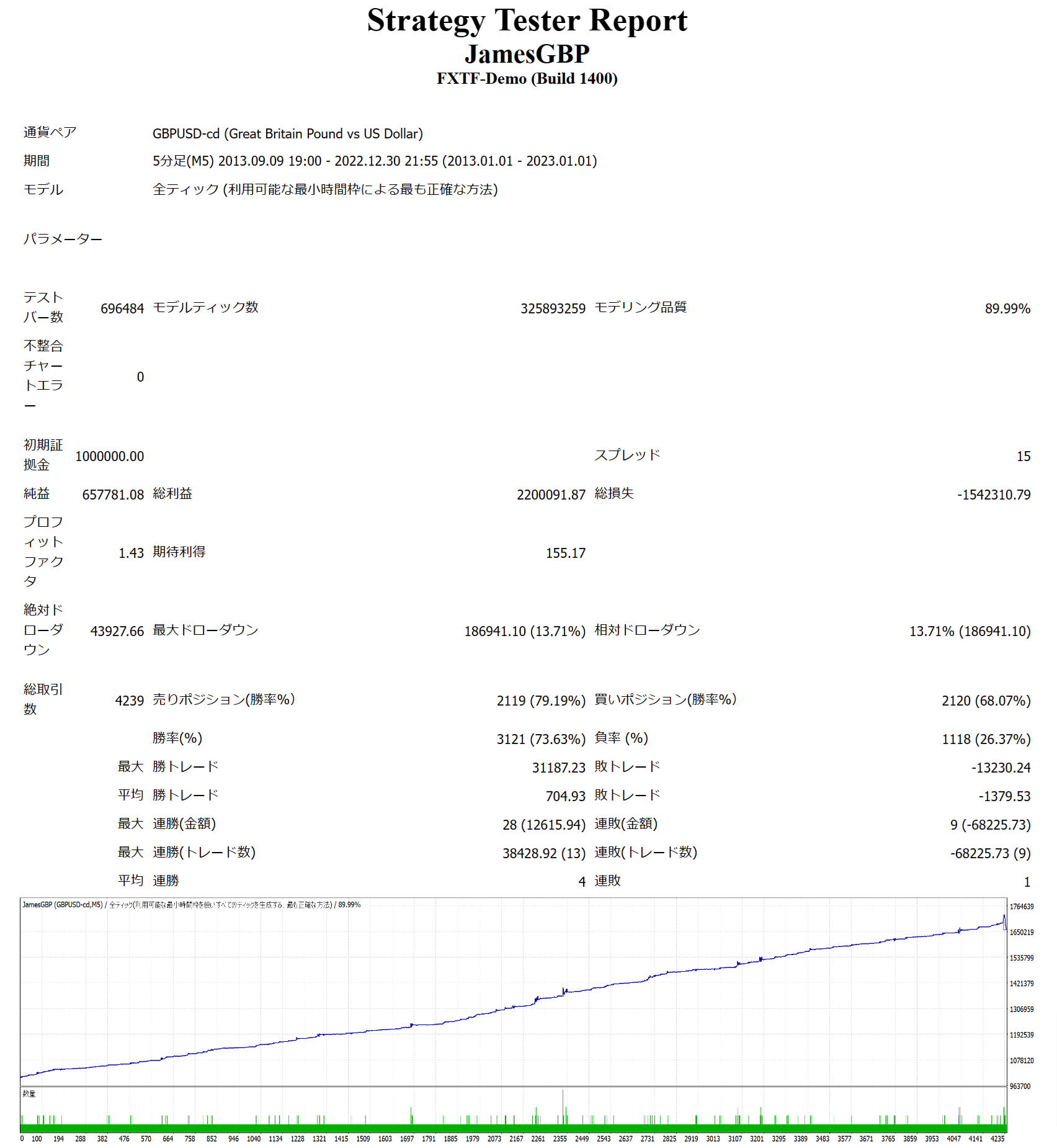 数千もの組み合わせの中から導き出した複数のSMAによって状況を判断してエントリー。 決済は5pips前後を目標利益としており、ナンピンの間隔・回数・ロット倍率を自動で調整しながら確実に利益確定していきます。 決済については、ポジション全体の損益が一定の利益以上になると全決済されます。両建てを行うこともありますが頻繁に決済されるのでノーポジションになることもあります。そのため、ご使用をやめたいときはお気軽にやめることも可能です。 検証では過去10年間分のバックテストで安定した結果を得ています。(2013年~2023年) 安全性を考慮してスプレッドは通常よりも高めに設定して検証していますので、スプレッドが高い業者でも安心してご利用いただけます。 無理のないトレードを行いますので初心者さんの敷居も低く、分散投資としてもオススメです。