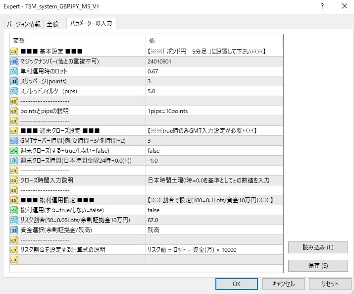 ●複利運用のリスク割合入力方式…資金1万円につき1000通貨の割合を100として入力する (計算式:リスク値 = ロット ÷ 資金(万) × 10000)