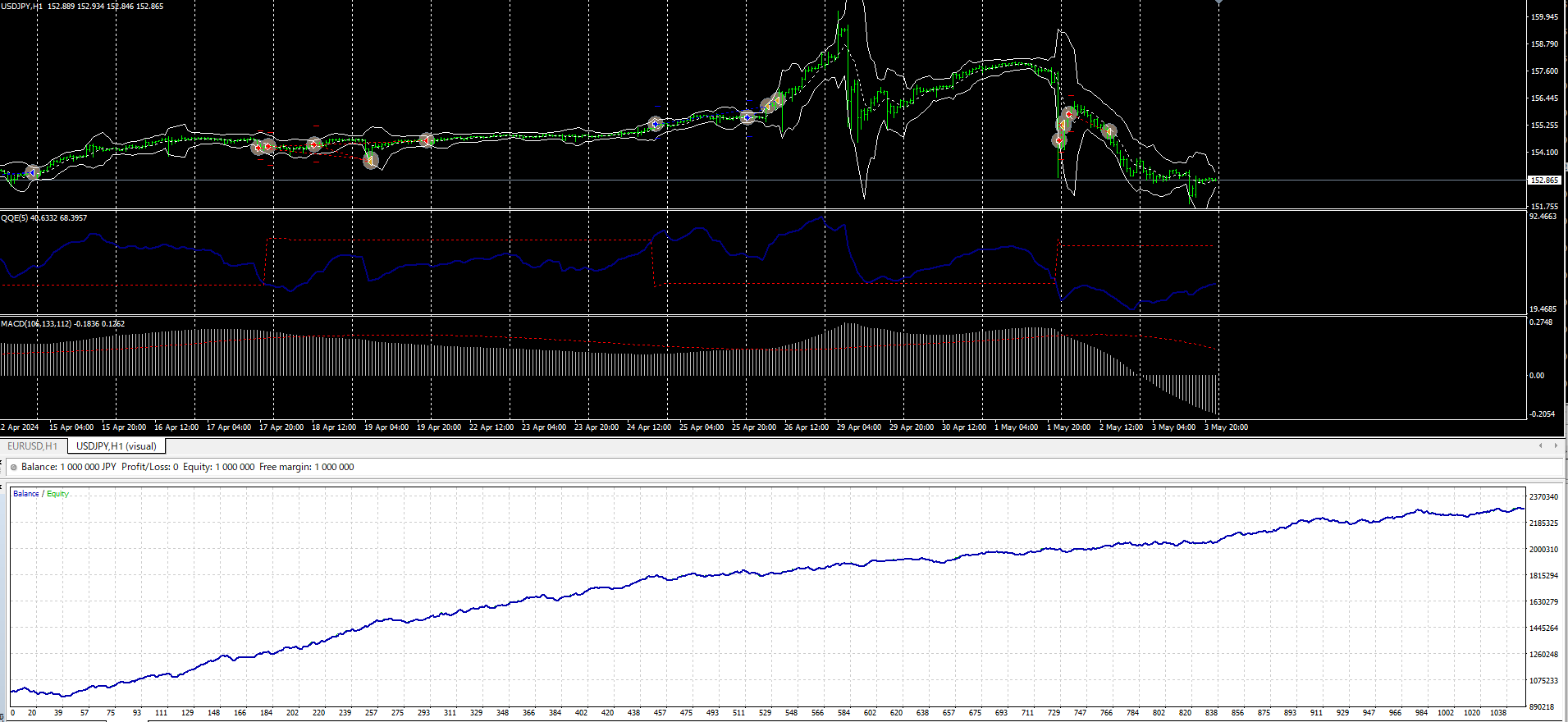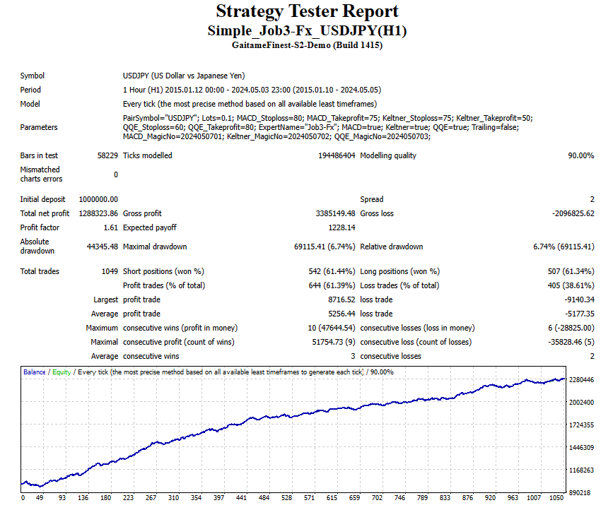 • EA の構成(セットアップ) MT4----expert--|----Simple_Job3-Fx USDJPY(H1).ex4 | |----indicators---・SqKeltnerChannel (添付ファイル) ・SqQQE (添付ファイル) ・MACD (MT4 標準)