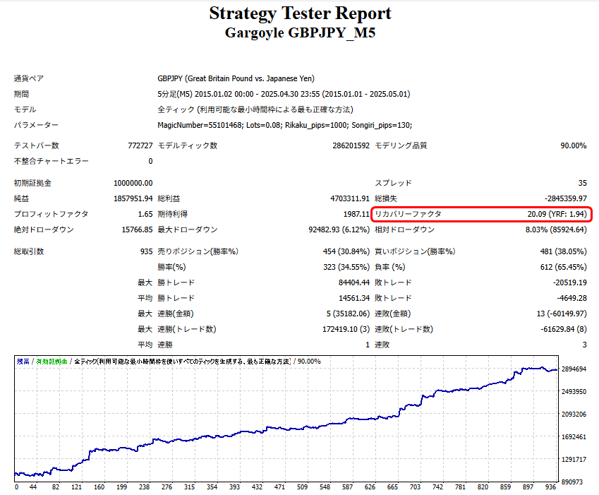 Gargoyleのリカバリーファクターは20.09と良いEAの基準とされる10を大きく上回り、年間平均でも「1.94」となっております。