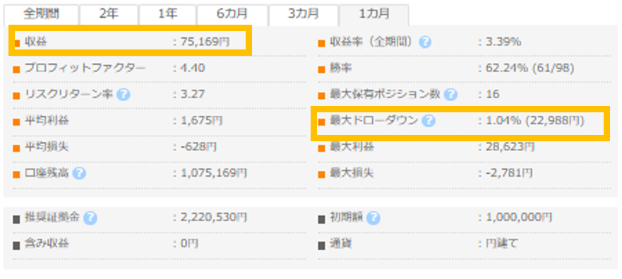 収益75000円に対し最大含み損が22300円(リカバリーファクターで、3.0倍以上)