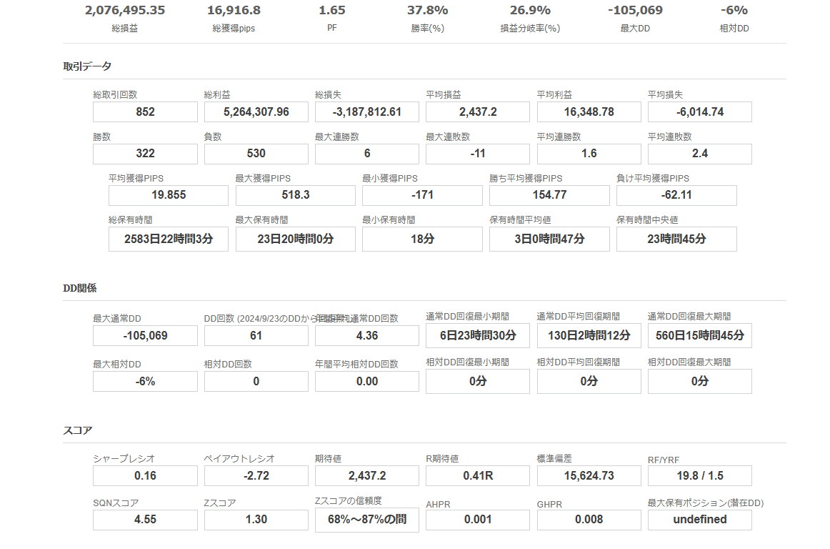 10年バックテストでは、Lots0.1あたり最大ドローダウンが10万5069円に対し利益が207万6495円