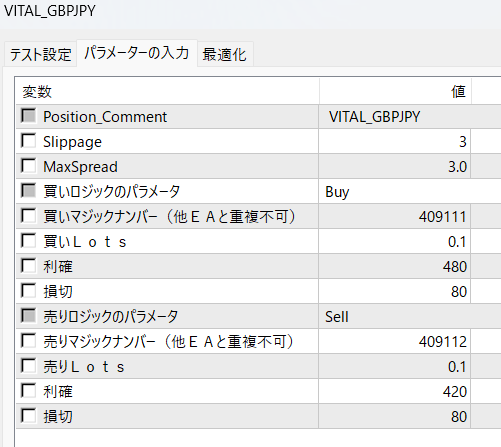 ・TP (Take Profit): The set profit-taking Pips (or specified amount, etc.) in the EA's settings