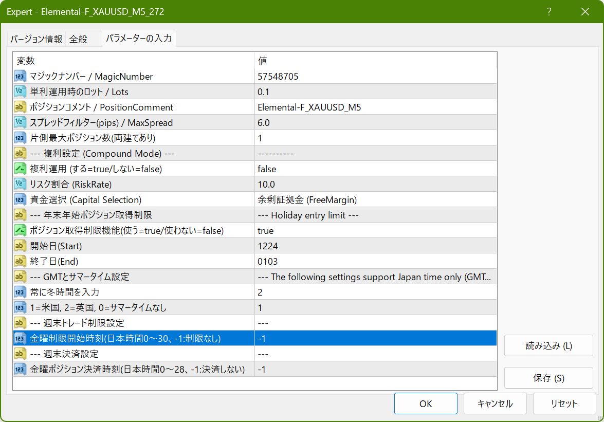 金曜日の指定時刻に既存ポジションを決済します。次週の市場オープンまでエントリーも制限します。 ・ポジション決済時刻(0-23:金曜 24-28:土曜 -1:決済しない) デフォルトは-1(決済無し) (重要)EAが動作していない場合や、取引時間外の場合等は機能しません。 ブローカー毎に取引時間は違います。特に年末はご注意ください。