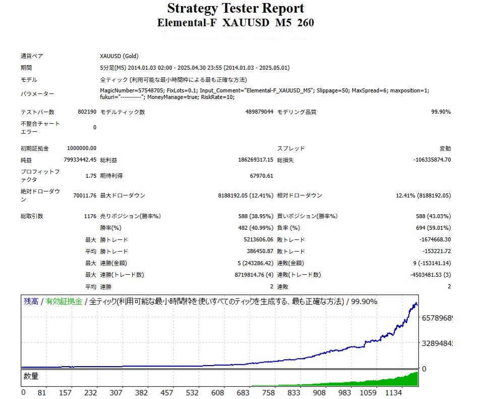 ゴールド(XAUUSD)のトレードは、その値動きの激しさで知られています。瞬時に大きな値幅が生じるため、チャンスとリスクが隣り合わせです。そんなマーケットにおいて、効率的に利益を追求できるEAを目指しました。 ・MAやローソク足の動きを利用した損小利大のロジックを搭載しており、損失を抑えつつ最大の利益を狙います。 ・複利機能を搭載で、利益を再投資しさらなる資産増加を狙います。 ・直近10年のデータを用いた最適化、モデリング品質の高いTick Data Suiteの変動スプレッド(最低スプレッドを3.0に設定)を使用してます。 ・XAUUSD M5専用のEAです。XAUUSDの取り扱いについてはブローカーにご確認ください。