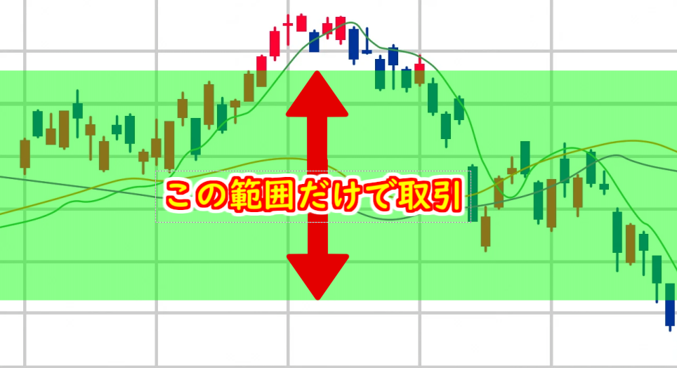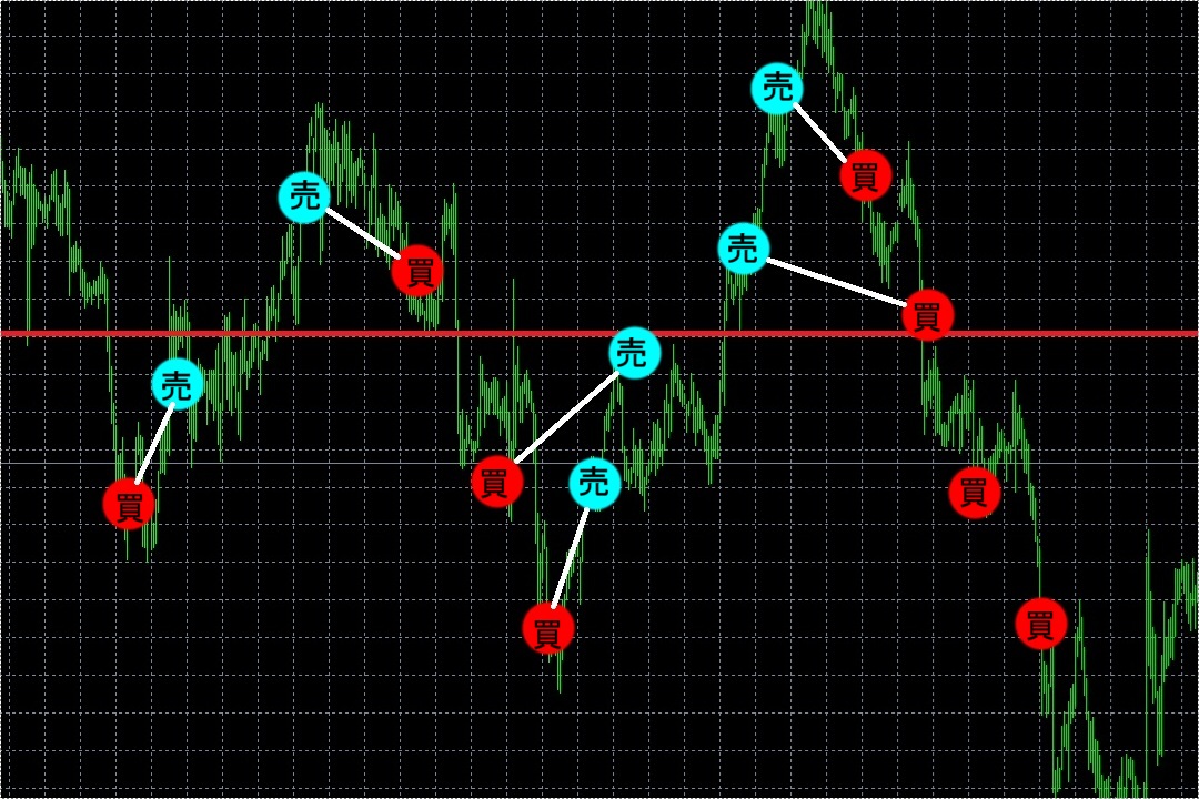 価格が下降しているとき、買いでエントリーします。順調に上がれば売りでクローズして利確します。更に価格が上がってラインをこせば、売りでエントリーし、価格が下がれば買いでクローズして利確します。このエントリー・クローズを繰り返します。