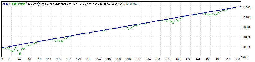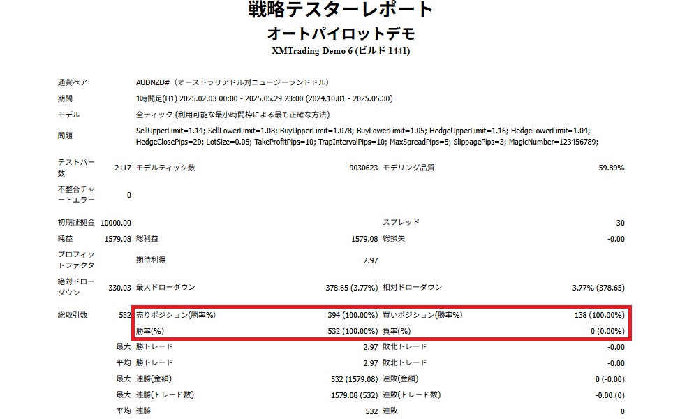 2025年2月~2025年5月末日まで約4か月間のバックテストの収益のグラフです。損切りをしないロジックですので、当然利益が積み上がり、このように綺麗な右肩上がりになります。